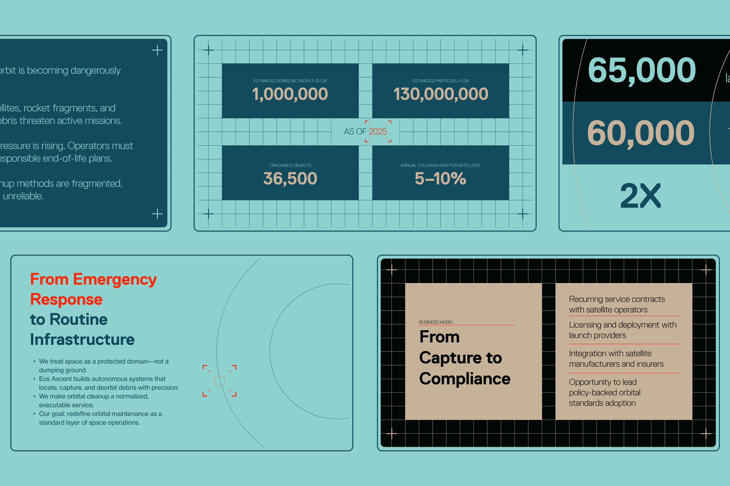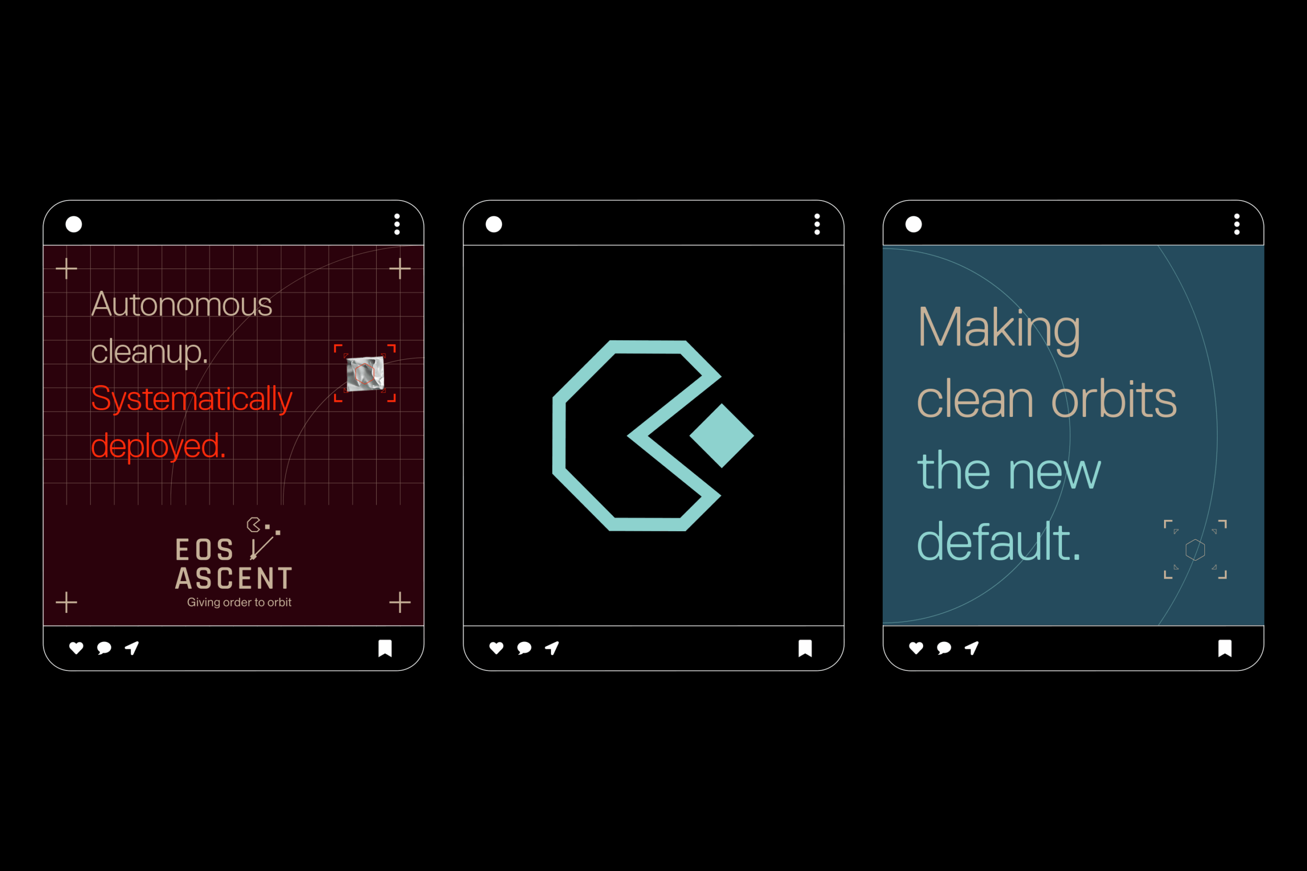 Eos Ascent is a space technology brand built on engineered integrity. It represents a commitment to precision, accountability, and transparency in every orbital debris removal mission. Designed for the aerospace and defense sectors, the identity favors system thinking and operational clarity over hype. The visual language draws from orbital mechanics and satellite architecture, using clean, symbolic marks that suggest capture systems, orbit paths, and modular frameworks. Eos Ascent is not built to dazzle. It is built to endure, communicating competence, ethical leadership, and long-term mission focus in a rapidly evolving space industry.